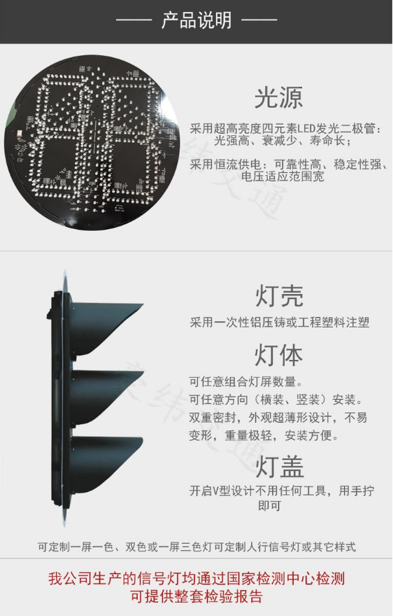 十字路口交通信號燈光源采用超高亮度四元素LED發(fā)光二極管:光強高、衰減少、壽命長;并采用恒流供電:可靠性高、穩(wěn)定性強、電壓適應(yīng)范圍寬 燈殼采用一次性鋁壓鑄或工程塑料注塑......